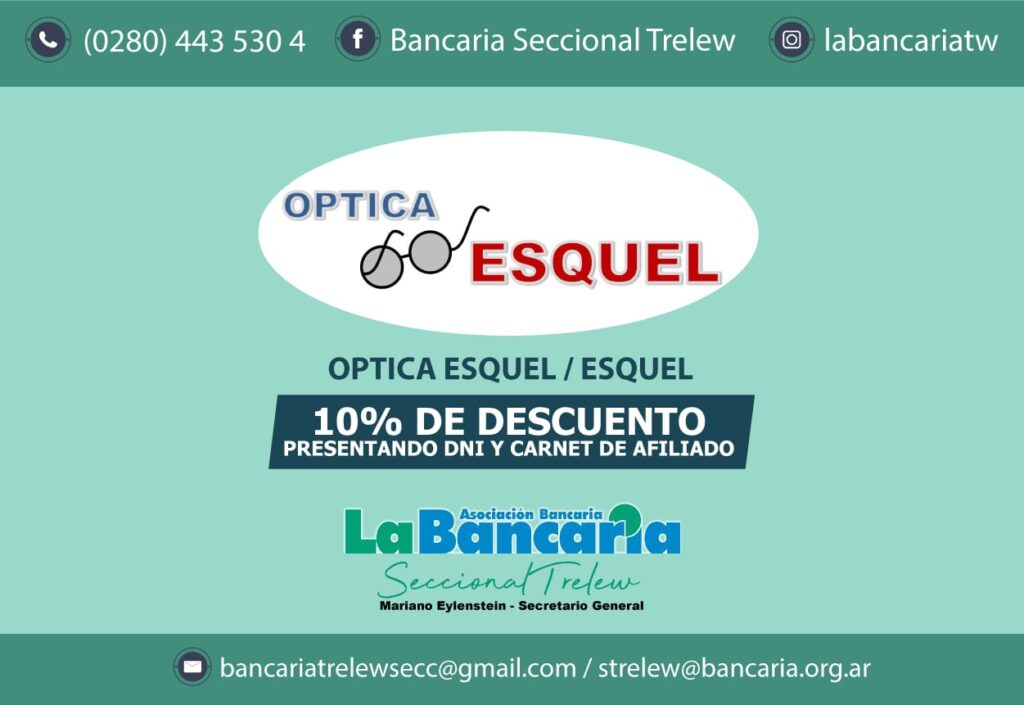 Óptica Esquel – 10% de descuento para afiliados a La Bancaria En Óptica Esquel, ubicada en la ciudad de Esquel, encontrarás una amplia variedad de lentes, monturas y servicios ópticos…